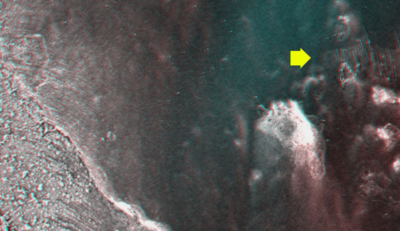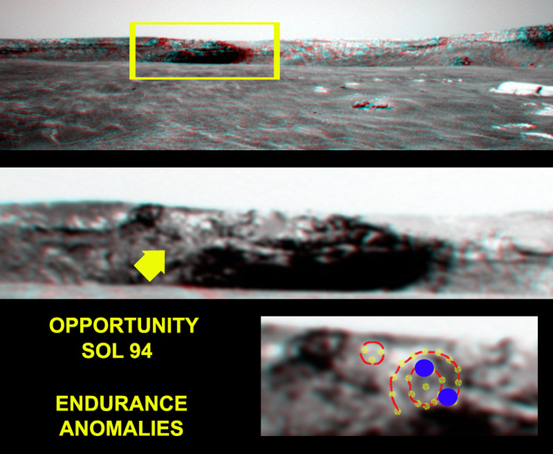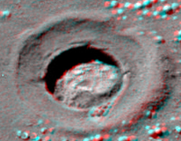 Passando al macroscopico, già in Drop Circles avevo avanzato l’ipotesi di una genesi organica dei crateri presenti sui corpi celesti del nostro sistema. Ora possiamo vedere nella foto 3D seguente un dettaglio di un foro praticato da Opportunity sul fondo apparentemente sabbioso di Endurance.