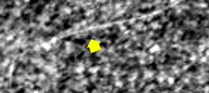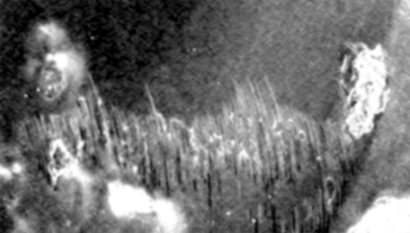 Questi filamenti non sono una novità; erano già apparsi in alcune forme isolate all’inizio della missione di Opportunity (Sol 10-11) ed erano stati attribuiti a fili sintetici provenienti dagli airbags. In realtà dalla foto seguente, fortemente ingrandita, si nota come anche in quel caso il filamento fosse composto di microgranuli, per di più attorcigliati in un percorso molto intricato intorno alle altre strutture vescicolari, di cui la freccia indica un esempio abbastanza chiaro.