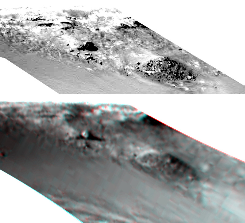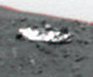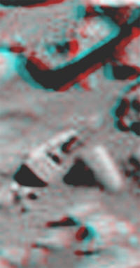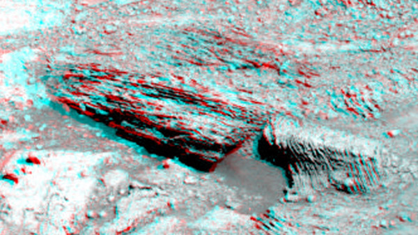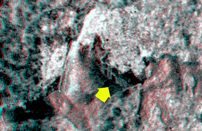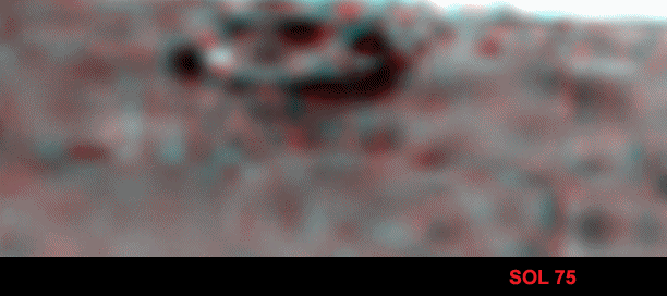 Namib è da diversi mesi una spina nel fianco della NASA, che fatica parecchio a nascondere quello che scaturisce dal terreno, come già avevo evidenziato nella tavola comparativa presentata all’inizio di Drop Circles. A titolo di esempio osservate questa immagine: in alto c’è il sito in versione “taroccata”, mentre in basso c’è una foto 3D della situazione reale, rubacchiata sullo sfondo di un’immagine panoramica. Se avete gli occhialini a lenti colorate potrete agevolmente vedere, al centro della foto in basso, un disco di non meno di due metri di diametro, che scaturisce dal terreno protrudendo una specie di appendice conica (scherzosamente lo potrei definire una specie di pizza con trombetta).