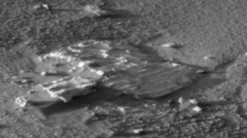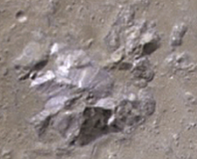 L’immagine parla da sola, per cui mi limito a far notare come il margine del foro sembrerebbe essere praticato più in una lastra di cartone pressato, che non in uno strato sabbioso. Il vuoto sottostante depone inoltre a favore del fatto che anche in questo caso il fondo del cratere sia in realtà un “doppio fondo” creato dalla rete di microorganismi. Non c’è da stupirsi che i tecnici NASA abbiano evitato di addentrarsi nel cratere: il vero motivo non è però quello del pericolo di insabbiamento, bensì quello che il peso del rover avrebbe potuto far crollare il “pavimento”. La struttura reticolare è presente in tutte le forme marziane, compresi i famosi “blueberries” di cui abbiamo spesso dissertato. Guardate per esempio questa immagine, in cui lo strato superficiale appare leggermente decorticato, rivelando l’intricata rete di microorganismi sottostante: