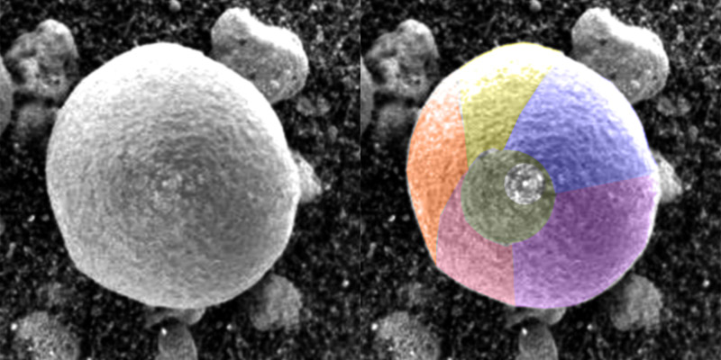 Notate come nella zona apicale di questa sferula appaia una microsfera a lucentezza metallica, contornata da una spirale di microorganismi, quasi una piccola “galassia”.