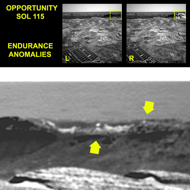In Sol95 si è posto riparo alla questione con il solito panorama finto, ma, dato che non c’è limite al peggio, in Sol115 è arrivato un altro scivolone, questa volta con la censura (riquadro giallo) della foto destra di una coppia stereo, che mostrava dei lastroni sollevati sormontati da sferoidi in prossimità del sito Namib.