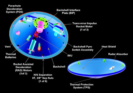 Mi scuso anche per la qualità delle immagini, dovuta in parte al poco tempo a disposizione (in fondo sono sicuramente l’agente segreto meno pagato della storia). Qualora qualcuno dubitasse sulla mia interpretazione, riporto un’altra circostanza in cui sono apparsi i suddetti lastroni con sferoidi, e più precisamente durante l’esplorazione da parte di Spirit del cratere Bonneville. La spiegazione ufficiale fu che si trattava di parti dello scudo termico della sonda precipitate durante la fase di atterraggio. Nella foto seguente riporto lo schema delle parti “incriminate”.