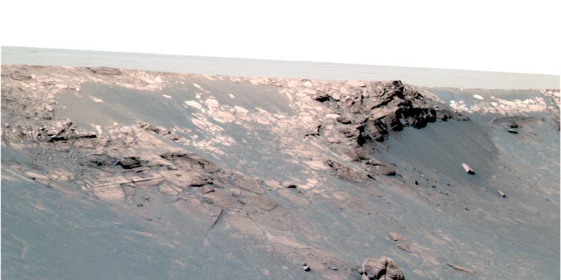 L’occasione è propizia per ricordarvi che l’uso degli occhialini a lenti colorate è praticamente indispensabile per valutare le foto stereo dei rovers, quelle con desinenza L0-R0,L2-R2 e L7-R1, tanto che la stessa NASA, al fine di impedirne l’utilizzo, spesso ne “dimentica” una sola delle due, confidando nella pigrizia degli appassionati. Ed è quindi con suprema malignità che vi sottopongo un altro esempio di rozza censura, incentrato sul bordo del cratere nei pressi del sito precedente.