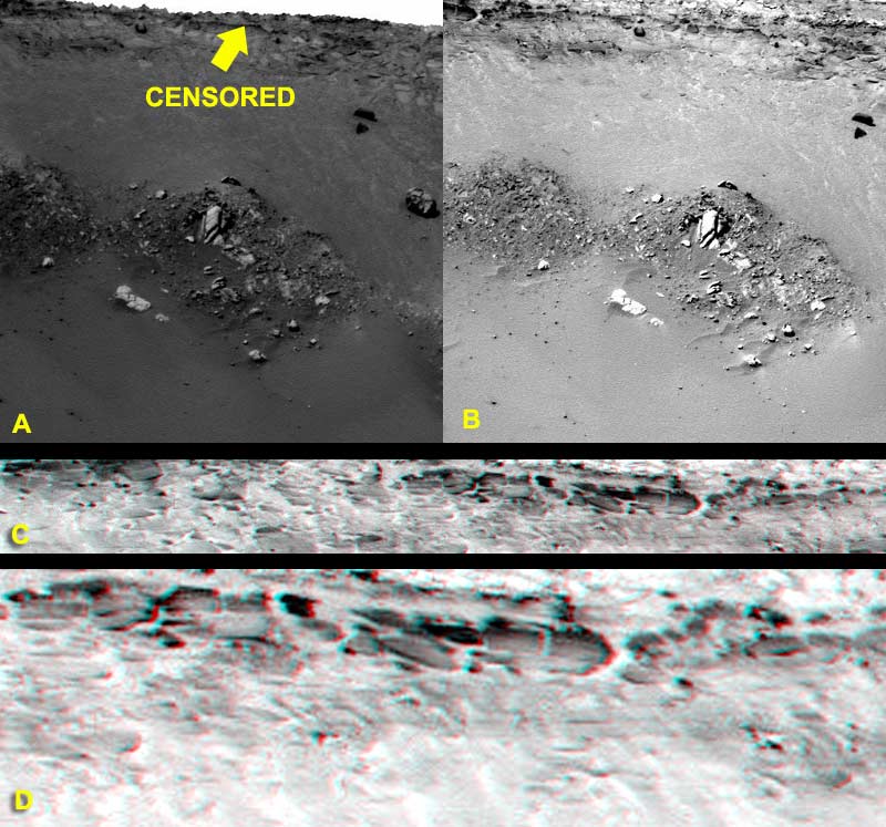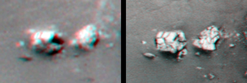 Ricordo per l’ennesima volta che la NASA non è particolarmente interessata a censurare segni di attività biologica: le creazioni dei Fondatori sono estremamente mimetiche e sfuggono facilmente ad un occhio non esercitato. Quello che veramente non si deve vedere è l’inopinato apparire di fenomeni energetici, levitazione di oggetti, variazioni dimensionali ecc. Non volendo influenzarvi, lascio a voi il piacere di giocare a “trova la differenza” con le foto della tavola; mi limito a informarvi che la foto in alto a destra è palesemente “ritoccata”, in modo da far sembrare tutto normale. Il fotomontaggio però è un metodo semplice per scoraggiare la maggior parte dei curiosi, ma fallisce quasi sempre se la foto è stereo. Ecco per esempio un confronto tra una foto 3D reale ed un fotomontaggio. Con gli occhiali 3D si vedono chiaramente nella foto di sinistra il solito ectoplasma trasparente (lato destro) e diversi oggetti in sospensione sopra il guscio al centro della foto. Nella foto di destra l’ectoplasma è scomparso e tutto appare “ragionevole”, ma l’inganno è facilmente smascherato dall’uso delle lenti speciali.