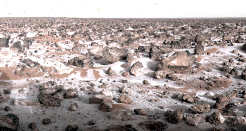 Nella foto A si vede come si è operata la censura sulla foto B. Nella foto C ho “recuperato” la zona censurata, di cui D rappresenta un particolare a più ampia definizione. Se possedete gli occhialini 3D vi sarà subito chiaro il motivo della censura. Come già vi avevo spiegato in “Like a Rolling Stone” le pareti del cratere sono percorse da “tubazioni” BVB sovrapposte e rivestite da lastre piatte BCS, e dalla foto si vede bene che la struttura assomiglia quasi ad un pezzo di legno tarlato. Ma dov’è lo scandalo? Alla NASA basterebbe dire che nei canali circolano o circolavano vermoni, simili a quelli dei film di serie B sui “Graboid”, e tutto finirebbe lì. Purtroppo non è così semplice. Perché la NASA potesse attuare per decine di anni una politica di disinformazione a livello planetario, era necessaria la connivenza di astronomi di altri paesi, compreso il nostro. Ora evidentemente diffondere la notizia che la maggior parte dei crateri non è derivante da impatti meteoritici, bensì dall’azione di organismi litogeni, causerebbe nella migliore delle ipotesi una totale mancanza di credibilità di quegli astronomi (praticamente tutti) che avessero sposato il paradigma della genesi da impatto. Dato che i suddetti astronomi hanno finora usufruito dei nostri soldi per raccontarci e scrivere sui libri di scuola le balle di cui sopra, è ben comprensibile che si cerchi di tenere il tutto in ibernazione controllata, in ambienti simili a quello della foto seguente (non è St.Moritz, la foto é del 1976-8, missione Viking).