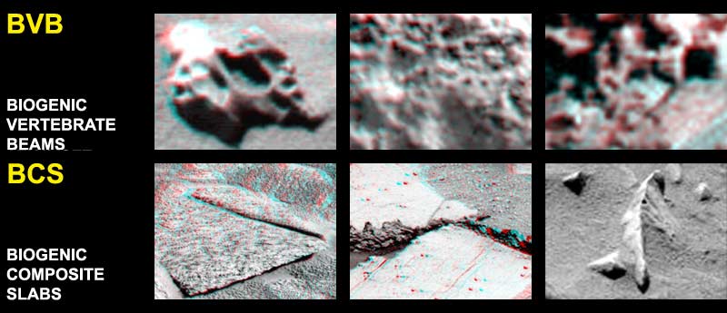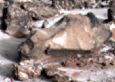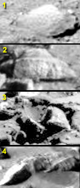 Come si vede dalle foto 1 e 2, i gusci, di forma semiovoidale allungata, vagamente cerebroide, presentano un’apparente simmetria bilaterale imperfetta con un cordone rilevato longitudinale e superficie rugosa, molto differente dalla solita apparenza lapidea. Dal guscio schiacciato dal rover della foto 3 possiamo notare come sulle pareti interne siano presenti delle forme pseudovertebrali, meglio evidenziate nell’immagine 4, che in un primo tempo avevo erroneamente attribuito ai “Dunemouse”. Le strutture pseudovertebrali, come del resto negli altri finti massi marziani, sono in grado di ribaltare parzialmente i gusci lasciandone intravvedere l’interno, popolato dalle “happy faces” dei “Tecnici” che si muovono in un “morphing” incessante come avevo già evidenziato nell’animazione seguente, ripresa da uno dei miei articoli precedenti.