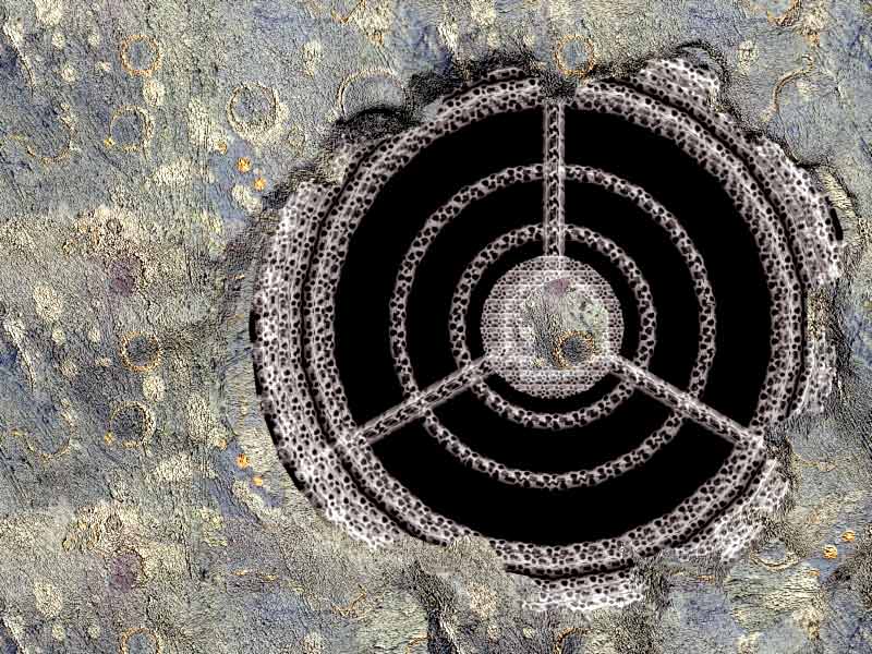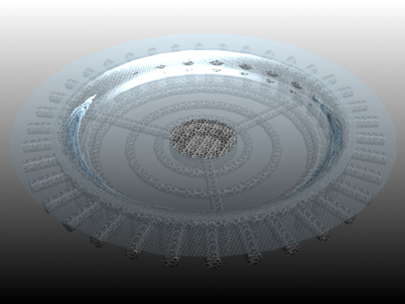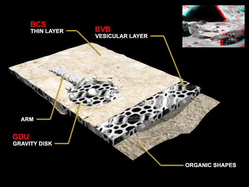 Come abbiamo visto dalle foto censurate la struttura base è costituita da vari anelli concentrici BVB disposti a quote digradanti verso il centro del cratere e intersecati da condotti orizzontali e verticali. In alcuni crateri, al centro è presente un ammasso di materiale, mentre in altri, come in Endurance, si hanno apparentemente degli accumuli di sabbia. Nei crateri di Meridiani, al posto delle similpietre di Gusev, troviamo le grandi arcate dei Fondatori, anch’esse disposte lungo il bordo del cratere e rivolte verso il centro. In questa immagine ho reso trasparente il terreno per poter vedere una ricostruzione schematica di larga massima dell’andamento strutturale degli anelli e dei condotti.