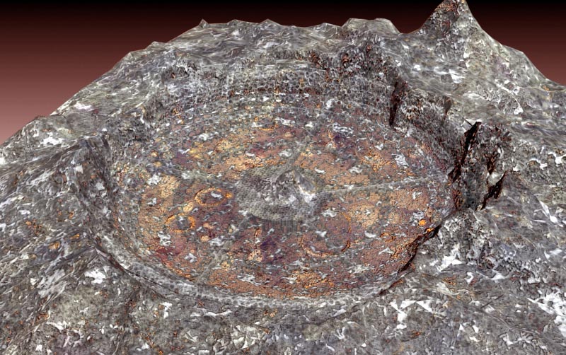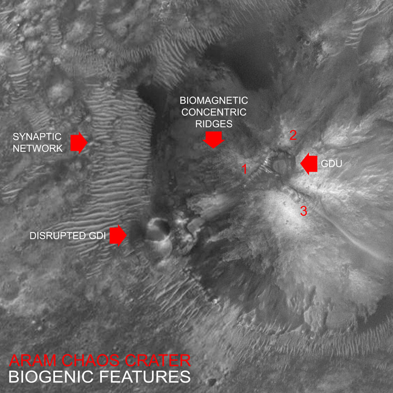 L’aspetto intrigante di queste strutture organiche è che sembrerebbero fatte apposta per creare una camera toroidale di accelerazione per un flusso di plasma superconduttivo, limitato da un campo di confinamento, magnetico o inerziale che sia, a temperature variabili tra 150° e 200° K. In questa eventualità gli “iniettori” GDI e le connesse formazioni pentatubolari rettilinee subsuperficiali potrebbero avere la funzione di fornire l’energia e la sovrapressione necessarie a provocare effetti antigravitazionali con la ricanalizzazione di flussi magmatici. L’ipotesi è azzardata ovviamente, ma l’esposizione al vento solare non rende poi così impossibile il pensare che possano esistere dei dischi volanti quasi “vivi”, da cui poter trarre elementi per sviluppare una tecnologia energetica di nuova generazione; in fondo non sarebbe la prima volta che il nostro progresso trae linfa vitale dall’imitazione della natura… La presenza di un effetto antigravitazionale potrebbe non essere solo una mia forzatura, ma forse una logica conseguenza, almeno se vogliamo dare un senso a dischi alti centinaia di metri e infissi nel terreno, come in questo dettaglio 3D di Aram Chaos (altro sito che come Sinus Meridiani manifesta la presenza di grandi quantità di ematite e di consistenti anomalie nel campo magnetico).