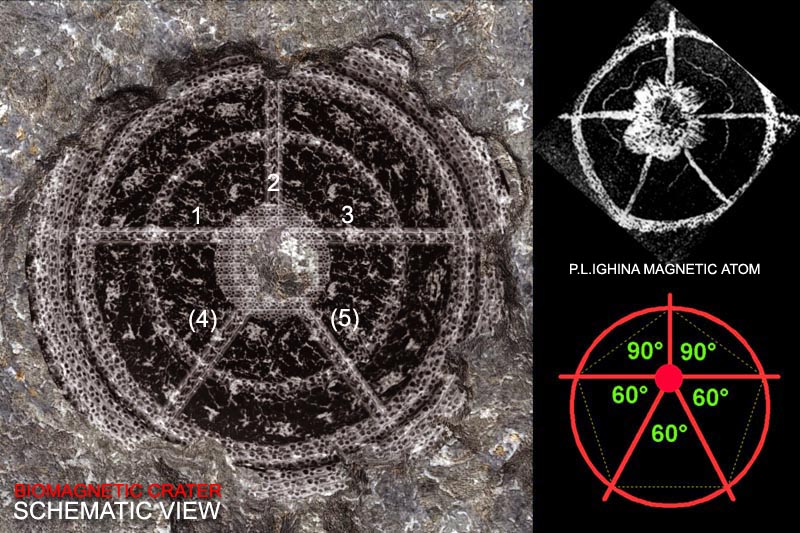 Nei pressi sono poi visibili delle formazioni tubolari concentriche, simili a quelle che già avevamo incontrato su scala diversa in foto riprese dal Microscopic Imager dei rovers della missione MER. Ora è bene precisare che, ad onta delle gigantesche dimensioni, queste strutture sono a mio parere organiche (o al più biogeniche), ma non artificiali e quindi i miei disegni sono da intendersi schematici e non realistici. In Drop Circles avevo già evidenziato la presenza dei 3 canali principali, ora quello che devo aggiungere è la frequente constatata presenza di altri 2 canali, che sembrano in realtà essere prodotti dal ripiegamento degli estremi di 2 dei canali principali, con modalità identiche a quelle che avevo evidenziato nel posizionamento sul terreno delle sferule in Vite al silicio e Universi paralleli. Questa disposizione pentagonale a lati arrotondati trova una singolare coincidenza con la struttura del cosiddetto “atomo magnetico”, fotografato nel 1940 dall’estemporaneo e geniale inventore P.L.Ighina. Forse non ci sarà relazione tra le due cose, ma ho riportato l’immagine allo scopo di meglio chiarire come la disposizione dei canali sia indicativa, in quanto nella realtà gli elementi costitutivi appaiono deformati o irregolari. Questa è comunque la struttura tipo alla luce delle considerazioni sopraesposte: