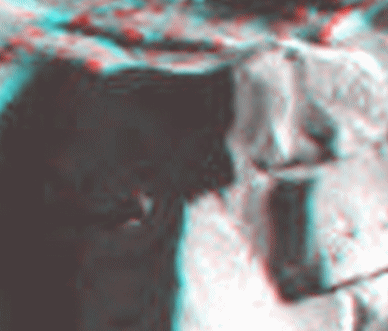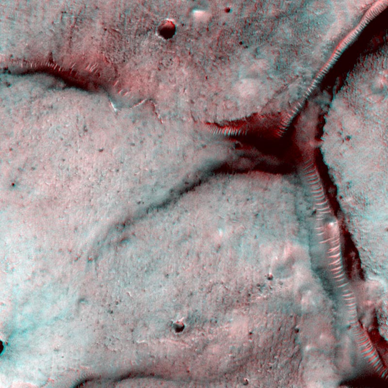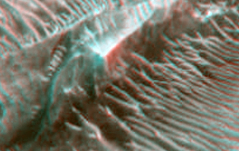 Dall’immagine 3D potete vedere come quelle che sembravano dune siano in realtà enormi strutture tubolari irregolari rigide, che infatti risultano sospese lungo la linea di frattura, lasciando intravvedere la cavità sottostante. La cosa è verificabile in tutte le immagini satellitari del MGS e dell’Odyssey, pur con lievi variazioni morfologiche ecotipiche, come nelle foto seguenti, riprese in due punti di Aram Chaos (usate gli occhialini 3D!).