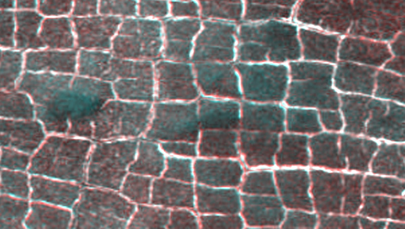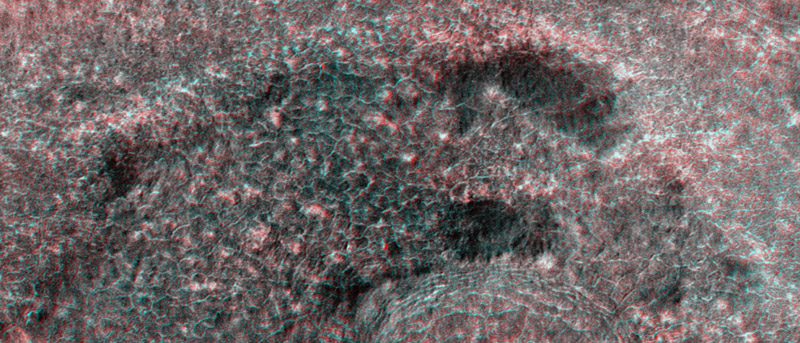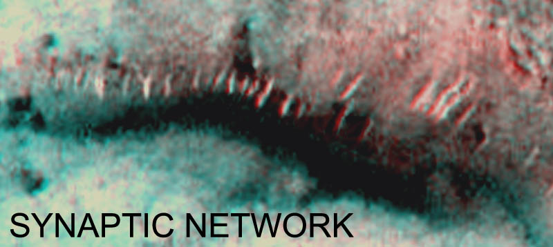 Oltre ai consueti canali concentrici e tunnel presenti lungo il bordo del cratere in basso, nei pressi è ben visibile (in 3D) l’intricata tessitura della rete sinaptica che sostiene il “terreno” circostante. Ma ancora più significativa è l’immagine seguente, che mostra un’altra zona dello stesso sito.