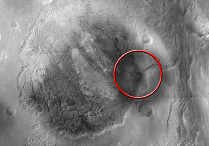 In questa immagine il disco rosso isola un settore di Aram Chaos in cui è visibile un ampio canale che termina in una specie di estuario, meglio evidenziato nell’immagine seguente.