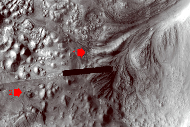 La freccia 2 indica una struttura che farà la felicità degli esoterici, perché è praticamente identica alla famosa “faccia” di Cydonia, ma è la freccia 1 quella su cui vorrei si soffermasse la vostra attenzione. Se osservate bene vedrete che la struttura che fuoriesce dal terreno termina in un disco traslucido coperto di sferoidi ed è circondata da altre strane formazioni. Purtroppo le strisciate NASA di dettaglio “stranamente” terminano subito prima del disco, comunque potete farvene un’idea dal seguente mosaico, in cui la parte sinistra è ricavata da una foto LR dell’Odyssey