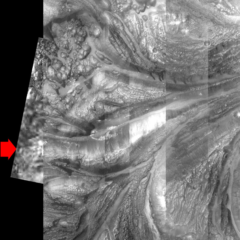 Questa strana struttura non è comunque né unica né inverosimile, perché su Marte possiamo trovare entità organiche (fossili o meno) identiche ed anzi forse ancora più spettacolari. Ricordo la frase di uno scienziato del JPL che accennava al fatto che tutto quello che era visibile su Marte era in qualche modo una replica di analoghe forme terrestri, solo enormemente più grandi… Insomma gli enormi canali ci sono, ma sotterranei, per cui Schiaparelli non avrebbe potuto vederli. Ed è sulla base di questa premessa che possiamo analizzare la foto seguente, ripresa da un settore di Eos Chasma, in cui la larghezza dell’immagine (e quindi della “creatura” raffigurata) è di circa 3 Km.