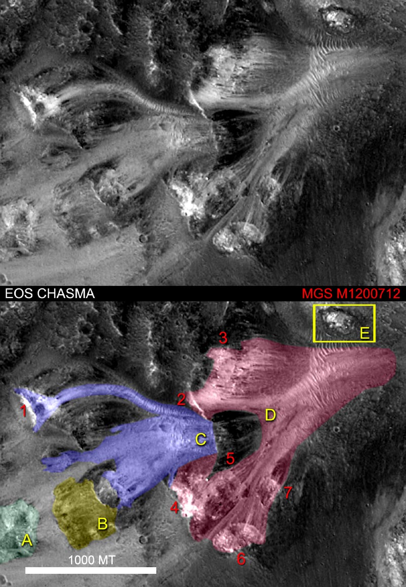 Nella versione in basso ho riportato in falsi colori gli elementi principali. I settori A,B e C si riferiscono ad una struttura ovoidale che potete ritrovare anche nella foto precedente di Aram Chaos, subito sopra il disco indicato dalla freccia rossa. In questo caso i vari settori appaiono come “strappati” l’uno dall’altro, forse per movimenti tettonici, e nel loro insieme sembrano essersi allontanati dal settore D, corrispondente al “gamberone” della foto precedente. Anche in questo caso le immagini mostrano come i canali corrugati terminino in strutture filamentose traslucide che inglobano strutture discoidali perpendicolari al terreno e identificate dai numeri in colore rosso. Nella foto seguente potete vedere un dettaglio del disco “fiorito” 1.