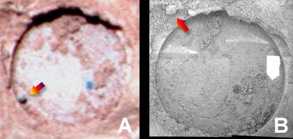 In the photo B, taken by Microscopic Imager, the arrow on the left shows the