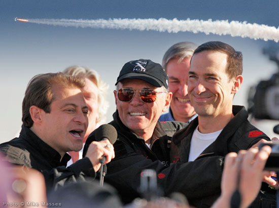| SpaceShipOne, primo velivolo ad andare nello spazio prodotto esclusivamente da privati, è stato selezionato, dal magazine Time, invenzione dell'anno . Realizzato dal progettista aerospaziale Burt Rutan (l'uomo in camicia azzurra che sorride dietro ai due a destra), SpaceShipOne è prodotto della sua ditta, la Scaled Composites di Mojave, California, fondata da Rutan nel 1982. Una giovane ditta la Scaled Composites, per la quale lavorano "solamente" 135 persone ma con enorme entusiasmo e passione per il proprio lavoro.