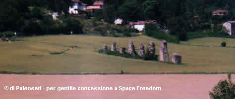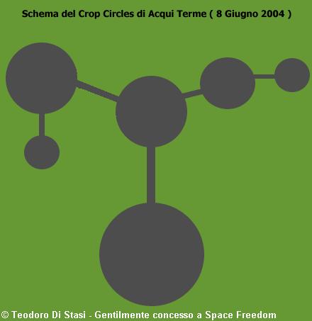Geometry triangular with circles at the top (three). It is not clear the presence of a fourth circle joined to one of those located to the tops through a segment (mentioned in one report not in the others). The triangle sides are about 18x18x20 meters while the diameter of each circle is about 6 meters Report by Il Giornale Report by Paleoseti