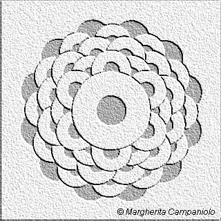 pentagono regolare stellato. E' inoltre da sottolineare come questo difficilissimo crop (per sviluppo e piante interessate) eseguito in modo impeccabile, sia "nato" in tre fasi successive. Le immagini da me elaborate ne descrivono le varie fasi, con varianti tutte realizzate sull'anello raggiato. |