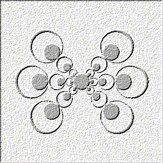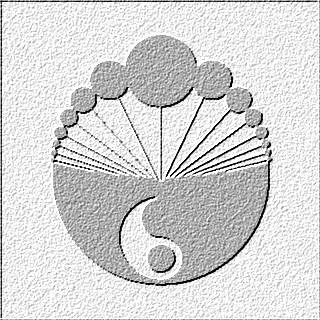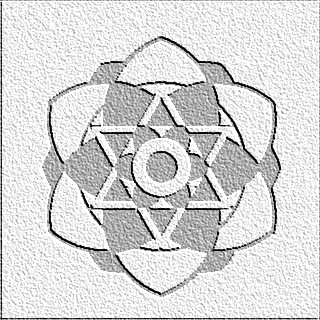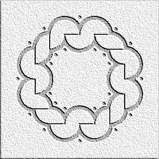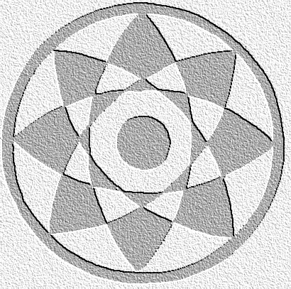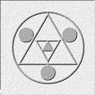 Serie di triangoli uno nell'altro. Il triangolo maggiore vede ogni lato un cerchio. Il tutto iscritto in un grande anello. | |||||