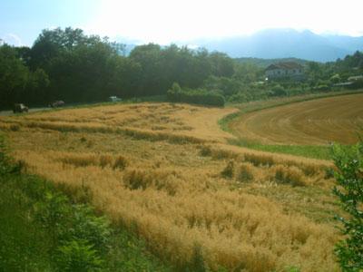 Further background information: A possible crop circle pointed out by four friends belonging to the group Ufoitalia: we were going to Giaveno (Torino), following the road to Avigliana. Soon as we left Trana, we met the cross-road to Coazze and turning on the left, after only 1,4 Km, we saw some drawings. Basic description of the design: It may be a “diagramma”