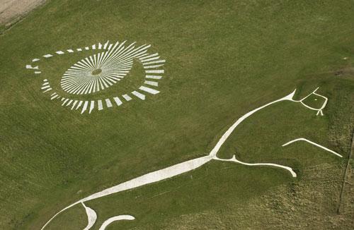 il primo è apparso l’1 maggio vicino al famosissimo cavallo bianco di Uffington in Oxfordshire, ad opera di sette circlemakers. La formazione, del diametro di 210 piedi, è stata dipinta sull’erba usando vernice atossica in un tempo di 7 ore. Dopo le riprese di rito, la stessa è stata ripulita dalla collina con potenti getti d’acqua!