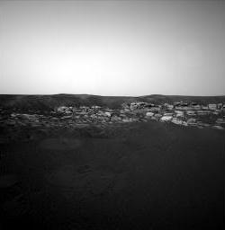 Prime immagini di Opportunity. Scruta avanti a sé le colline del Capitano il terreno attorno. Si concede un "autoscatto".