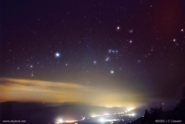 mostra la costellazione di Orione (a destra) e Sirio (a